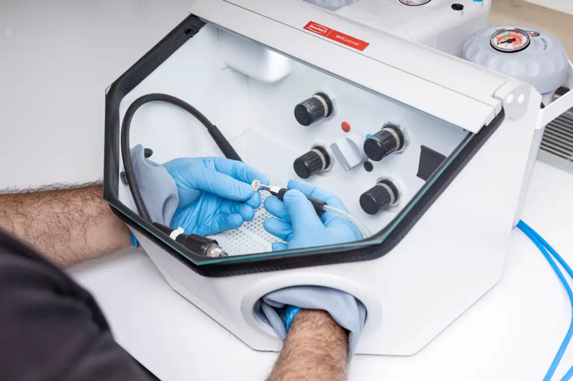 La primera arenadora de precisión científicamente validada para el acondicionamiento clínico de superficies de restauraciones antes de la cementación definitiva.